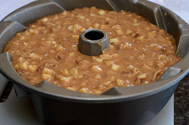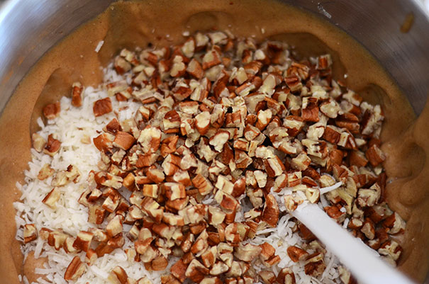 - Fold apples, coconut, and pecans into batter.