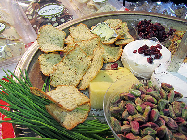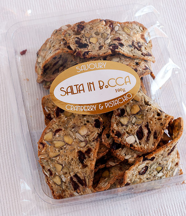 So instead we have for your viewing pleasure this wonderful savoury bread twice baked like an almond bread. It’s served with cheese and is really delicious. Therese from Salta in Bocca in Adelaide gave it to us as a gift during our Flavours of Campbelltown tour. Here’s what the other variety looks like in her cheese platter.