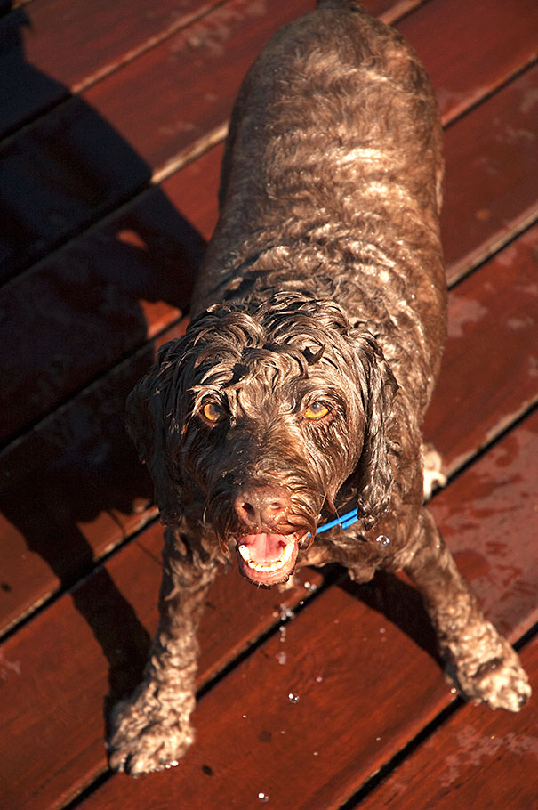 Looks like Charlie was able to wash off his chorizo ‘red lips’ when he splashed into the water. The look on his face says, “Mummy, you forgive me for eating your chorizo, don’t you?”