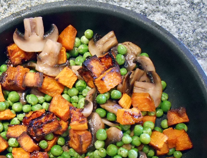 - While the risotto is cooking saute the mushrooms in oil and once they've released their juices, toss in the frozen peas to thaw while the risotto cooks.